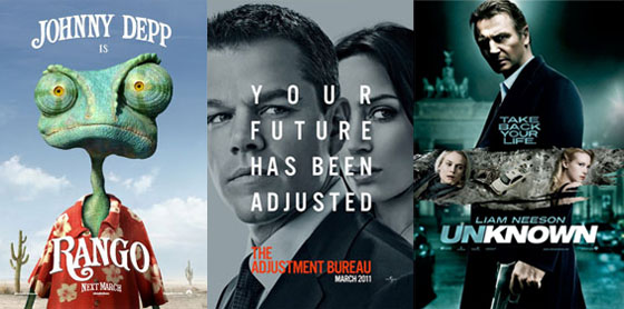 Rango (Paramount): Animated film about a chameleon (voiced by Johnny Depp) who aspires to be a swashbuckling hero and finds himself in a Western town plagued by bandits and is forced to literally play the role in order to protect it.