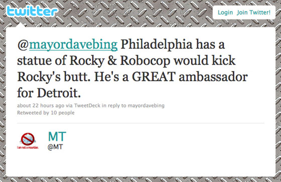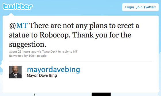 The campaign began last week when someone suggested on Twitter to the city’s mayor (the wonderfully named Dave Bing) that a statue of the character from Paul Verhoeven’s 1987 film was needed.