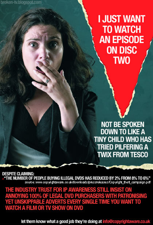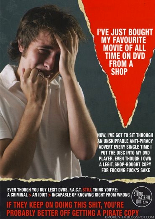 These two posters accurately reflect the frustration of anyone who has legally bought a DVD and put it in the player only to be confronted with a patronising advert (that you can’t skip!) which informs you that piracy (the very thing you just haven’t done) is both bad and wrong.