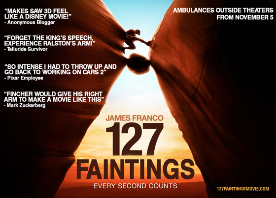 After hearing the initial reports of faintings at Telluride, it seemed that the marketing folk at Fox Searchlight would have a job on their hands trying to convince people that 127 Hours wasnāt a new horror franchise from Lionsgate.