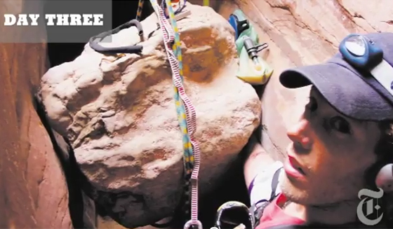 First, there is this New York Times video profile, Pushing the Limit: Being Aron Ralston, which features the man himself describing the events of 2003 (along with the photos he took in the canyon) and his life since.
