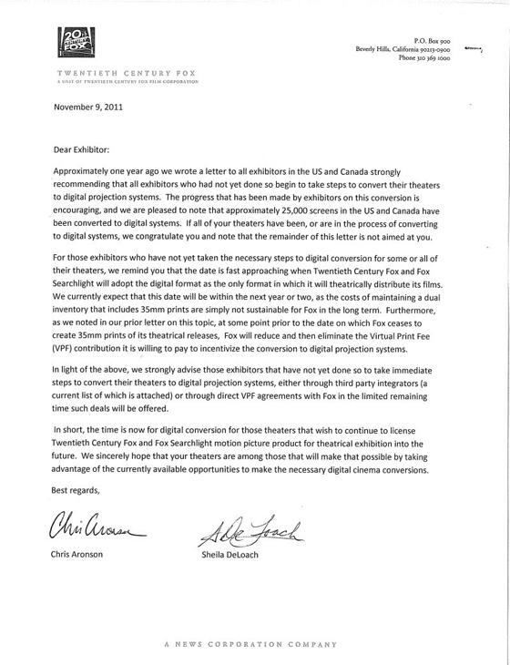 “For any exhibitor who can hear my voice who hasn’t begun your digital transition, I urge you to get moving. The distribution and exhibition industries achieved history when we agreed to technical standards and a virtual print fee model to enable this transition. But the VPFs won’t last forever. Domestically, you must be installed by the end of 2012 if you want to qualify. Equally significantly, based on our assessment of the roll-out schedule and our conversations with our distribution partners, I believe that film prints could be unavailable as early as the end of 2013. Simply put, if you don’t make the decision to get on the digital train soon, you will be making the decision to get out of the business.”